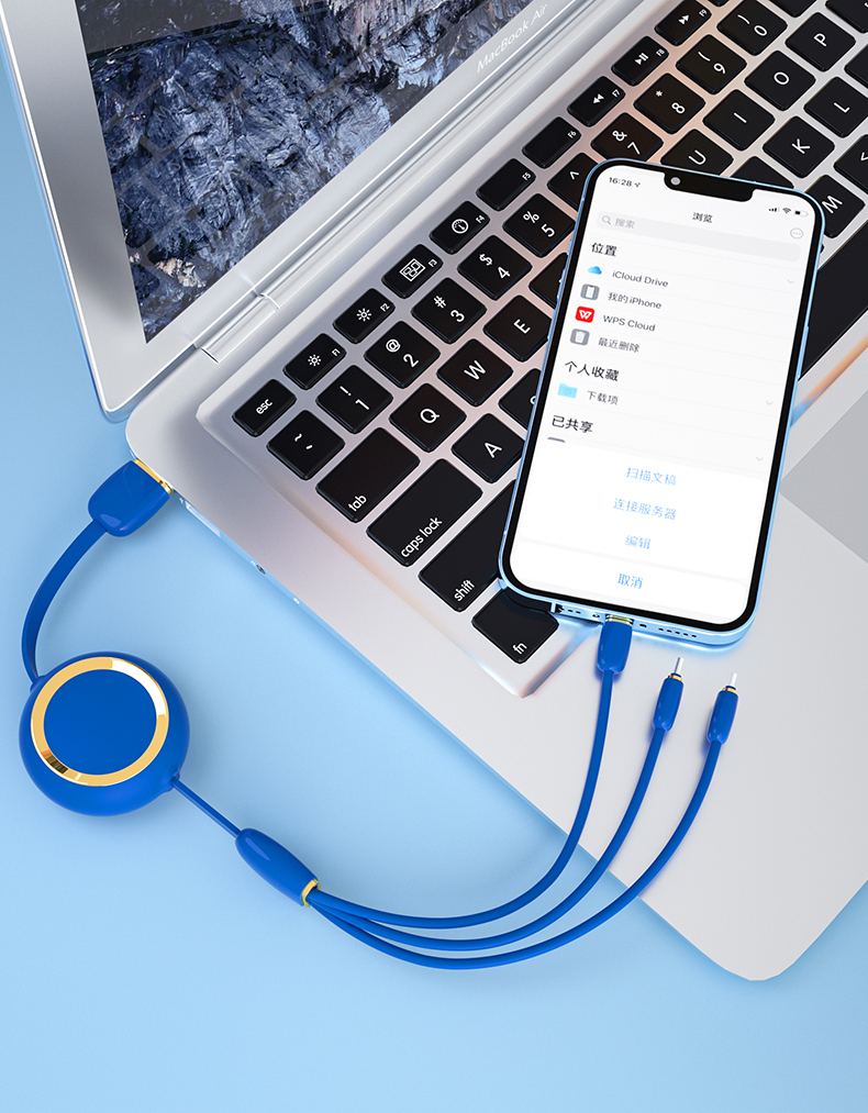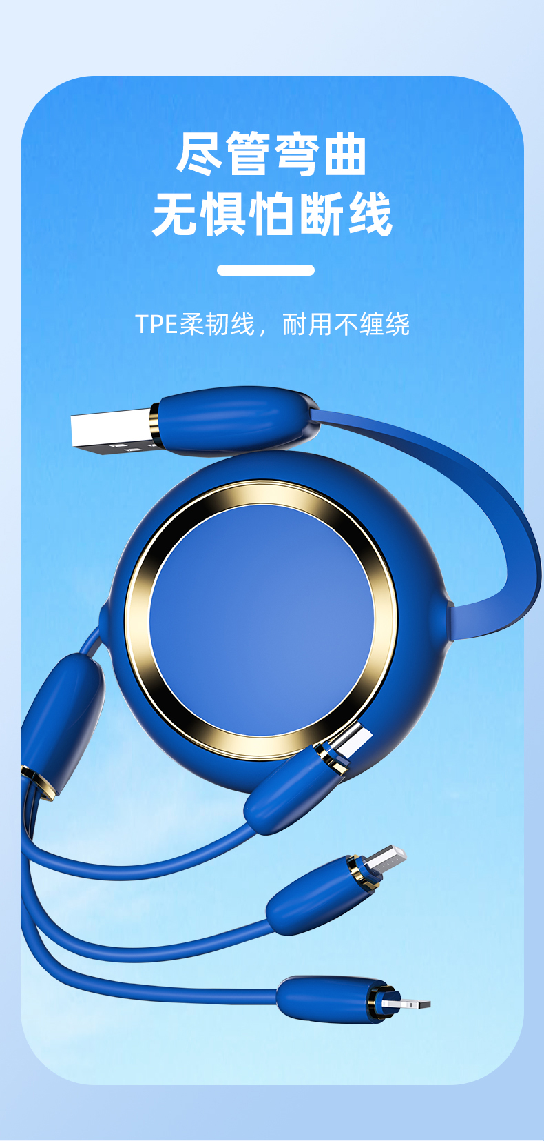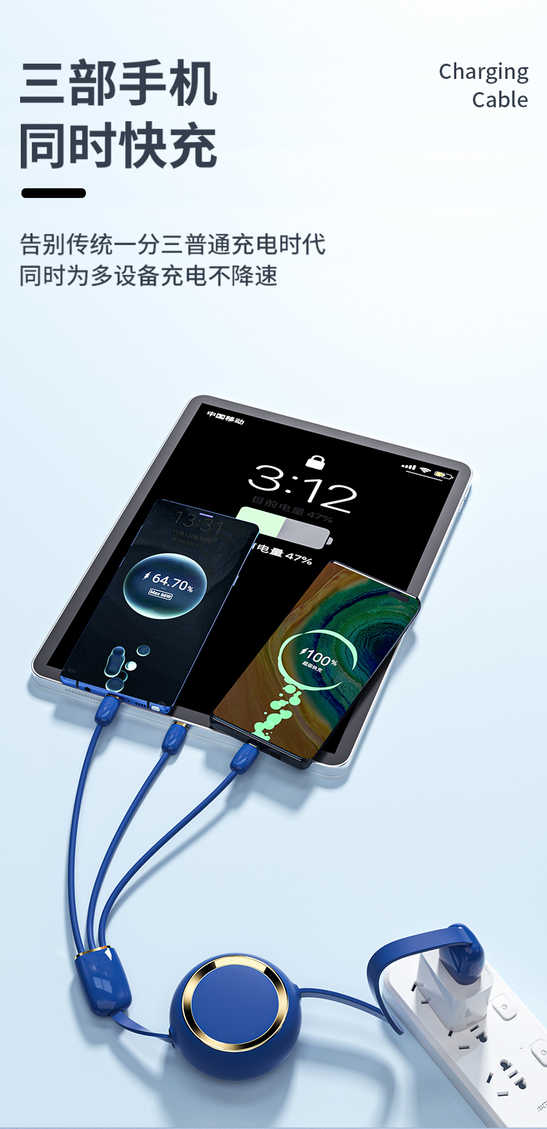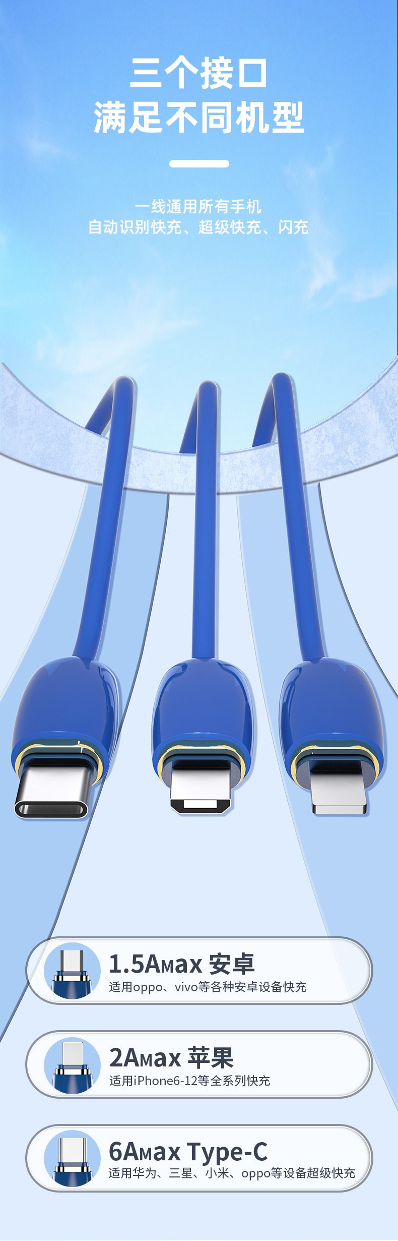 三个接口满足不同机型,一线通用所有手机自动识别快充,超级快充,闪充,